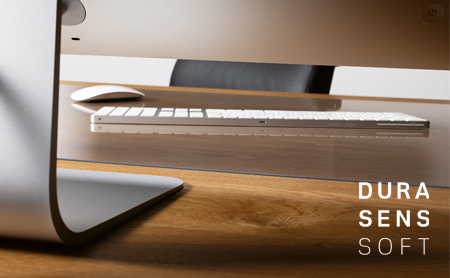 If the table is no longer spotless, Durasens Soft can make it shine again – in line with the motto „optimise instead of renew.“ On new, very high-quality surfaces, the environmentally friendly PET desk pad offers optimum protection against dirt and liquids. It is characterized by very high impact and break resistance and has a smooth, transparent surface.